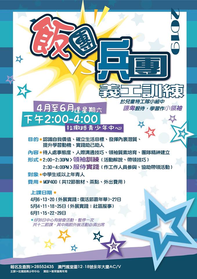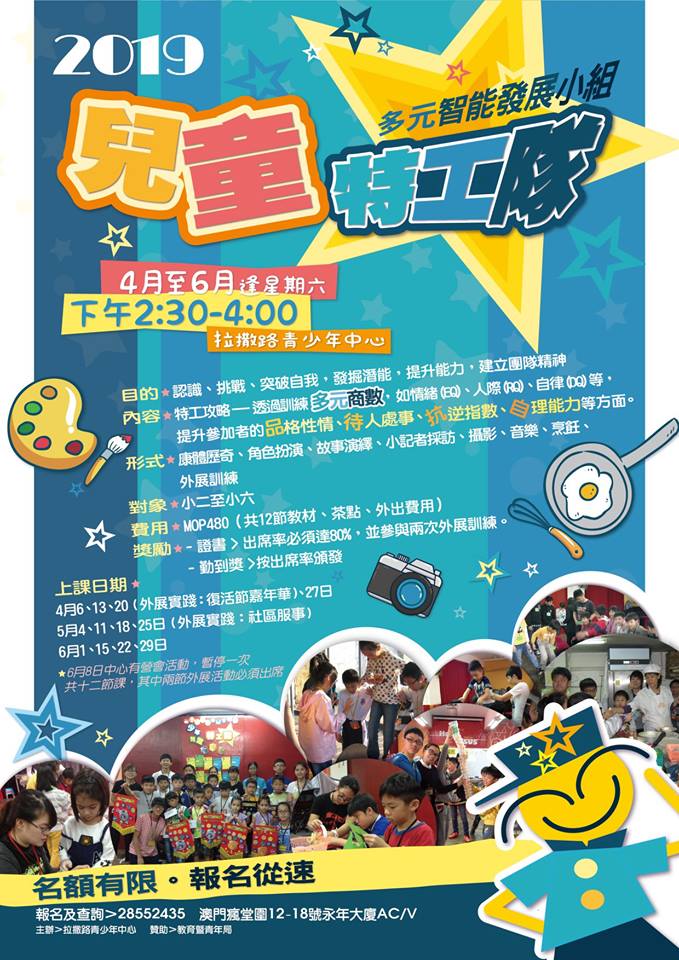 兒童特工隊-多元智能發展小組 期待已久的「兒童特工隊-多元智能發展小組」終於開班了!今期特工攻略將透過多元商數,來訓練各位小特工的成長品格、待人處事、抗逆能力、自我管理等。4月6日正式上課,歡迎各位小二至小六朋友仔參加!快啲報名啦! 兒童特工隊相簿集 贊助 其他文章 2019年全澳教師培靈會澳門,栽培,校園 港澳基督教聯合書展2019澳門,宣教,閱讀,文化 2020澳門福音遍傳運動宣傳澳門,福音 2019籌款活動及義賣日澳門,教育,見證,健康 澳門基督徒對香港示威的神學思考時事,社會 基督教文化在澳門澳門,城市,教會 新書:西教士與當代澳門教會澳門教會歷史,教會 勞綺華傳道見證分享澳門,見證,教會 2020全澳崇拜人數統計澳門,教會 豐盛國度視覺藝術展_影片影視,文化 協安中心招聘職員「為澳門鼓舞」活動理念分享會