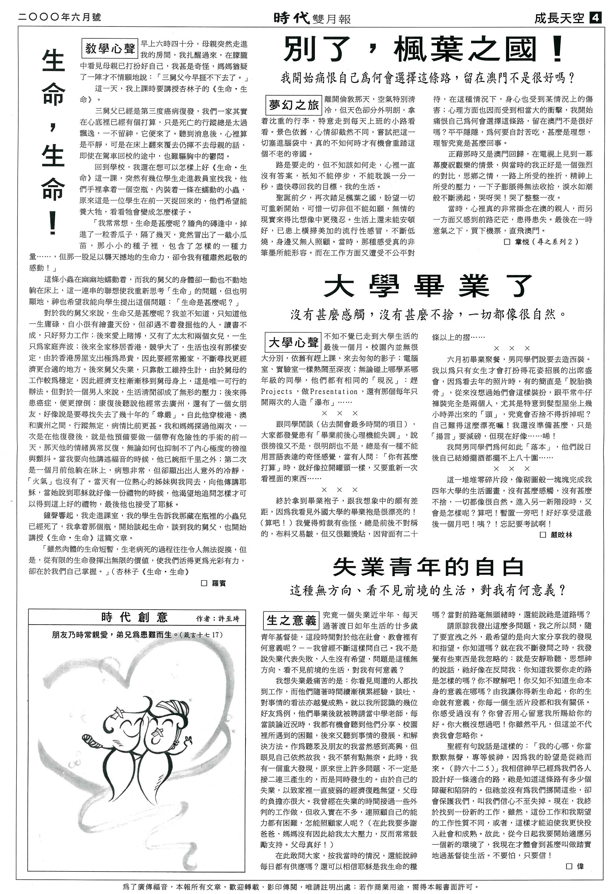 對於我的舅父來說,生命又是甚麼呢?我並不知道,只知道他一生庸碌,自小很有繪畫天份,但卻遇不發掘他的人,讀書不成,只好努力工作;後來愛上賭博,又有了太太和兩個女兒,一生只為家庭奔波;後來全家移居香港,競爭大了,生活也沒有那樣安定,由於香港房屋支出極為昂貴,因此要經常搬家,不斷尋找更經濟更合適的地方。後來舅父失業,只靠散工維持生計,由於舅母的工作較為穩定,因此經濟支柱漸漸移到舅母身上,這是唯一可行的辦法。但對於一個男人來說,生活清閒卻成了無形的壓力;後來得患癌症,便更撩倒;康復後聽說他經常去廣州,還有了一個女朋友,好像說是要尋找失去了幾十年的「尊嚴」。自此他穿梭港、澳和廣州之間,行蹤無定,病情比前更甚。我和媽媽探過他兩次,一次是在他復發後,就是他預備要做一個帶有危險性的手術的前一天,那天他的情緒異常反復,無論如何也抑制不了內心極度的徬徨與顫抖。當我要向他講述福音的時候,他已婉拒千里之外;第二次是一個月前他躺在上,病態非常,但卻顯出出人意外的冷靜,「火氣」也沒有了。當天有一位熱心的姊妹與我同去,向他傳講耶穌,當她說到耶穌就好像一份禮物的時候,他渴望地追問怎樣才可以得到這上好的禮物,最後他也接受了耶穌。