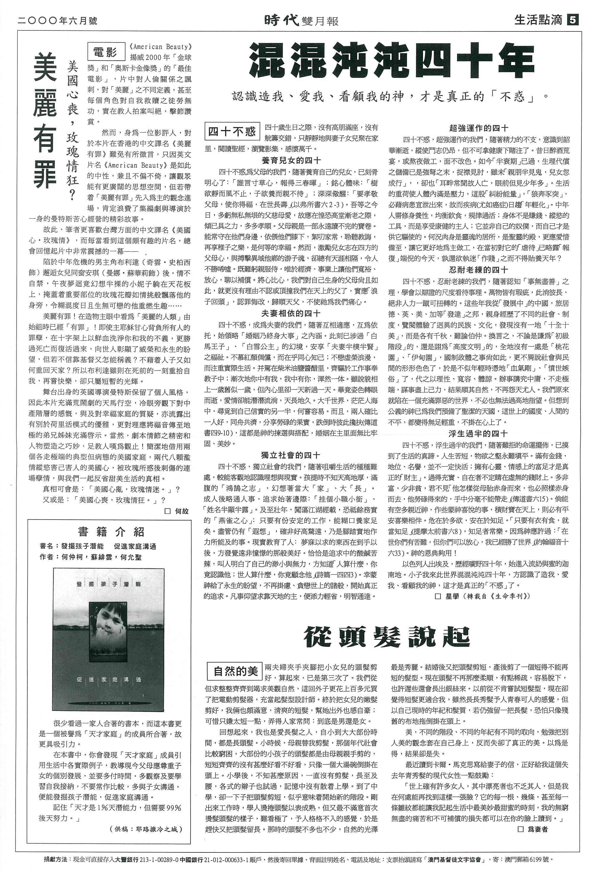 四十不惑,為父母的我們,隨著養育自己的兒女,已刻骨明心了﹕「誰言寸草心,報得三春暉」;銘心體味﹕「樹欲靜而風不止,子欲養而親不待」;深深儆醒﹕「要孝敬父母,使你得福,在世長壽」(以弗所書六2 -3 )。吾等之今日,多虧無私無垠的父慈母愛,故應在惶恐高堂漸老之際,傾已具之力,多多孝順。父母親是一部永遠讀不完的寶卷。能常守在他們身邊,依偎他們膝下,絮叨家常,聆聽教誨,再享稚子之樂,是何等的幸福。然而,激勵兒女志在四方的父母心,與搏擊異域他鄉的游子魂,卻總有天涯相隔,令人不勝唏噓。既難躬親服侍,唯於經濟、事業上讓他們寬裕、放心,聊以補償。將心比心,我們對自己生身的父母尚且如此,就更沒有理由不認或頂撞我們在天上的父了,實應「浪子回頭」,認罪悔改,歸順天父,不使祂為我們痛心。