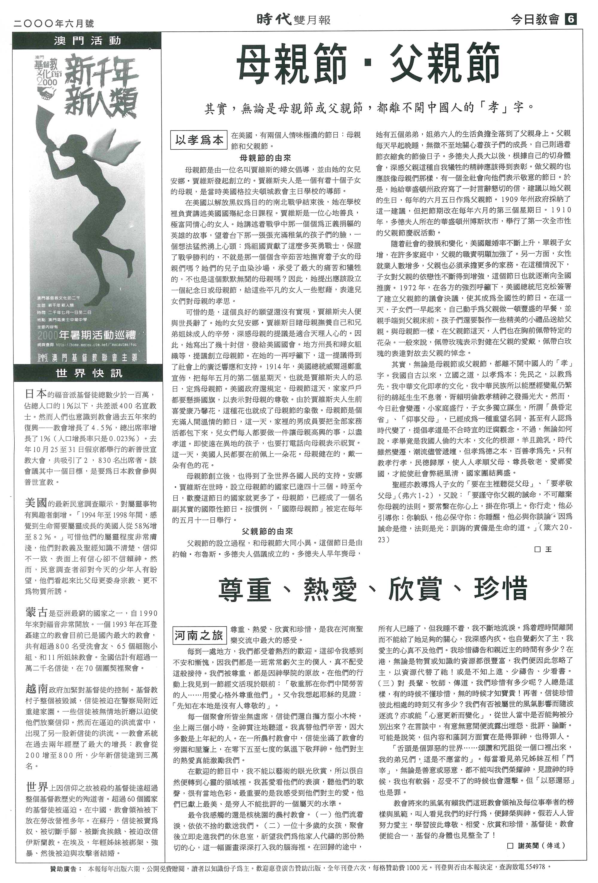 其實,無論是母親節或父親節,都離不開中國人的「孝」字。我國自古以來,立國之道,以孝為本;先民之,以教為先,我中華文化即孝的文化,我中華民族所以能歷經變亂仍繁衍的綿延生生不息者,胥賴明倫教孝精神之發揚光大。然而,今日社會變遷,小家庭盛行,子女多獨立謀生,所謂「晨昏定省」、「仰事父母」,已經成為一種重望名詞,甚至有人認為時代變了,提倡孝道是不合時宜的迂腐觀念。不過,無論如何說,孝畢竟是我國人倫的大本,文化的根源,羊且跪乳,時代雖然變遷,潮流儘管遞嬗,但孝為德之本,百善孝為先。只有教孝行孝,民德歸厚,使人人孝順父母、尊長敬老、愛鄉愛國,才能使社會弊絕風清,國家團結興盛。