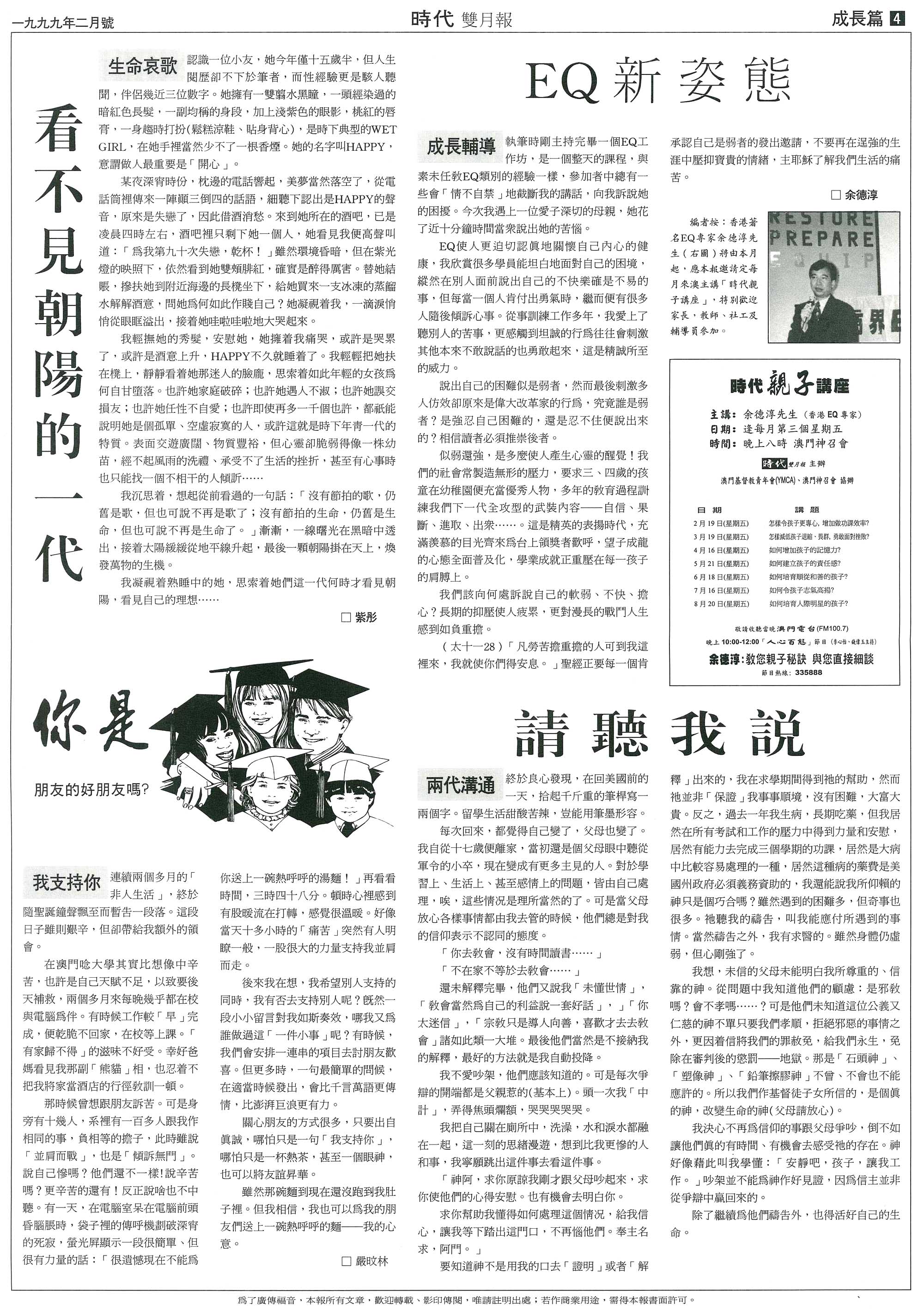 那時候曾想跟朋友訴苦。可是身旁有十幾人﹐系裡有一百多人跟我作相同的事﹐負相等的擔子﹐此時雖說「並肩而戰」﹐就是「傾訴無門」。說自己慘嗎﹖他們還不一樣!說辛苦嗎﹖更辛苦的還有﹗反正說啥也不中聽。有一天﹐在電腦室呆在電腦前頭昏腦脹時﹐袋子裡的傳呼機劃破深宵的死寂﹐螢光屏顯示一段很簡單﹑但很有力量的話﹕「很遺憾現在不能為你送上一碗熱呼呼的湯麵﹗」再看看時間﹐三時四十八分。頓時心裡感到有股暖流在打轉﹐感覺很溫暖。好像當天十多小時的「痛苦」突然有人明瞭一般﹐一股很大的力量支持我並肩而走。